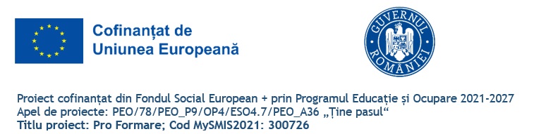CAMERA DE COMERȚ ȘI INDUSTRIE GORJ în parteneriat cu CAMERA DE COMERȚ ȘI INDUSTRIE MUREȘ anunță lansarea proiectului „Pro Formare” în cadrul apelului PEO/78/PEO_P9/OP4/ESO4.7/PEO_A36 „Ține pasul“, prioritatea P09 „Consolidarea participării populației în procesul de învățare pe tot parcursul vieții pentru facilitarea tranzițiilor și a mobilității (ESO.4.7).